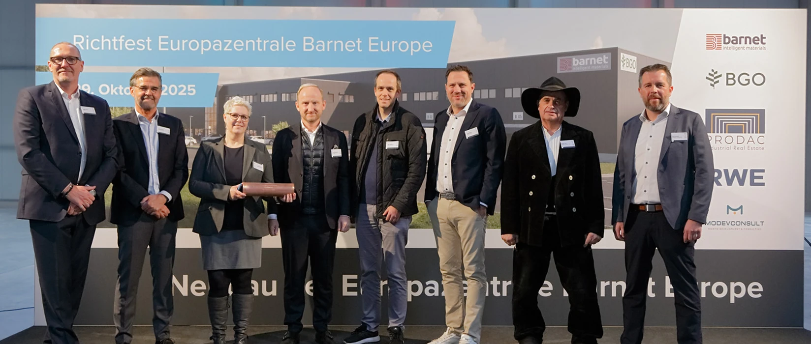 Mit einem symbolischen Richtfest haben PRODAC und Barnet Europe den Baufortschritt der neuen Barnet Europazentrale in Eschweiler gefeiert, rund fünf Monate nach dem ersten Spatenstich. PRODAC errichtet in Zusammenarbeit mit BGO die maßgeschneiderte Europazentrale für das global agierende Produktions-, Recycling- und Handelsunternehmen Barnet Europe an einem für das Unternehmen strategisch wichtigen Standort.